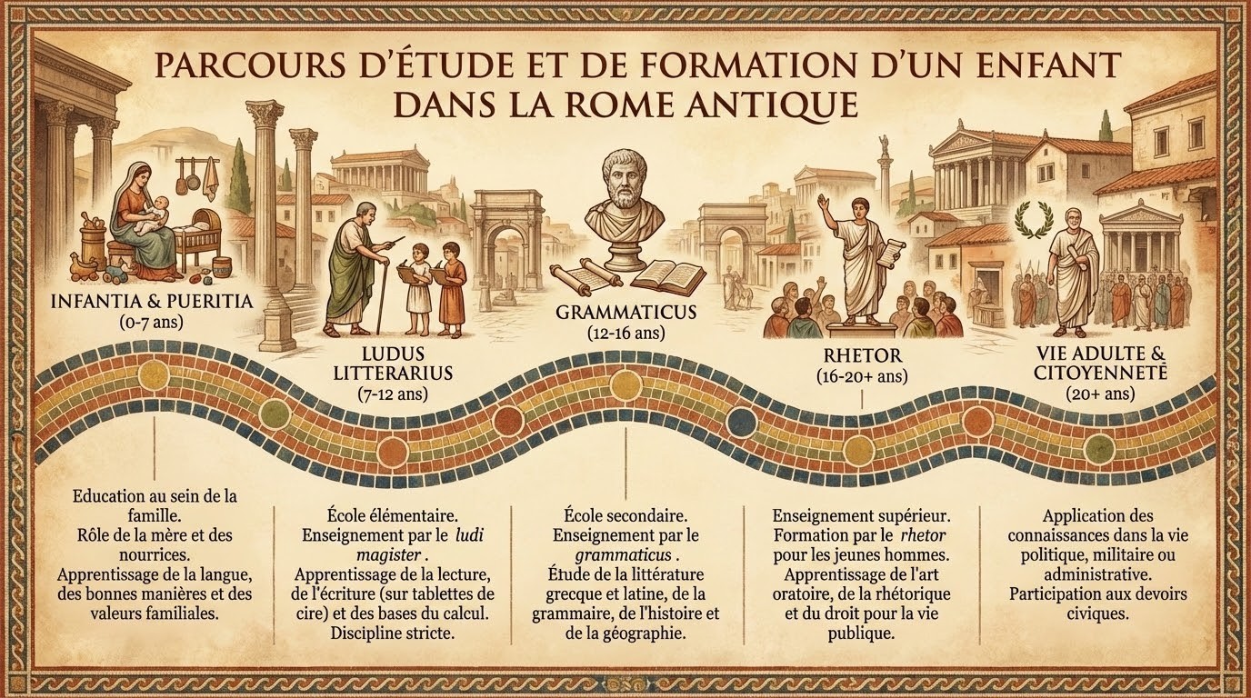 L’éducation est d’abord une affaire de famille. Le père (paterfamilias) est le principal éducateur, transmettant les valeurs fondamentales de virtus (courage, vertu) et de pietas (devoir envers la famille, les dieux et la patrie). [...]. Cliquez sur l'image pour lire la suite !